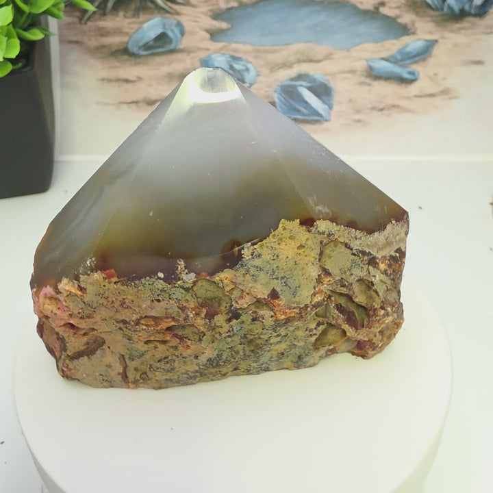 I’ve always felt that these "half-and-half" Half Polished Brazilian Agate pieces are some of the best ways to appreciate geology because they tell a complete story of the stone. This Half-Polished Brazilian Agate point is a perfect example. By leaving the lower sides in their natural, rough state while polishing the front face to a high gloss, you get to see the stark contrast between the rugged exterior and the intricate beauty hidden within the volcanic host rock.