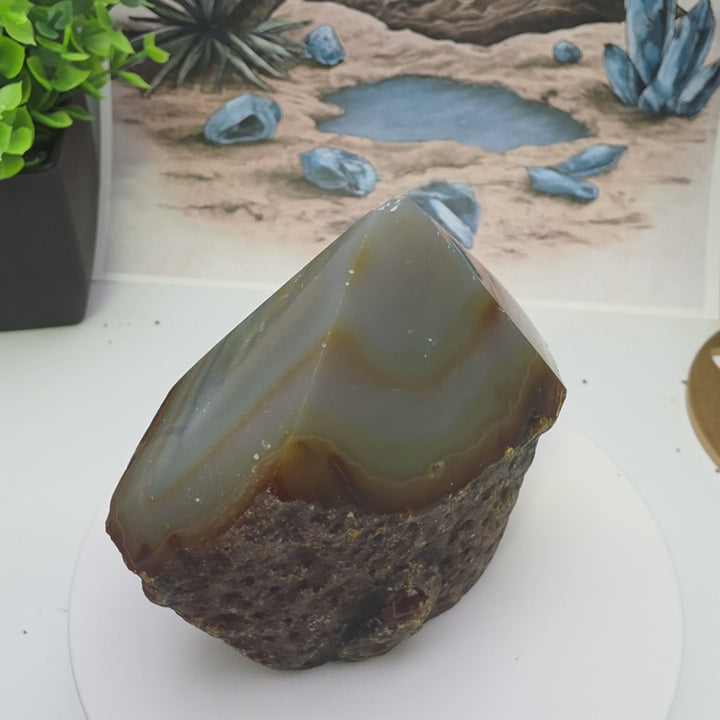 I’ve always felt that these "half-and-half" Half Polished Brazilian Agate pieces are some of the best ways to appreciate geology because they tell a complete story of the stone. This Half-Polished Brazilian Agate point is a perfect example. By leaving the lower sides in their natural, rough state while polishing the front face to a high gloss, you get to see the stark contrast between the rugged exterior and the intricate beauty hidden within the volcanic host rock