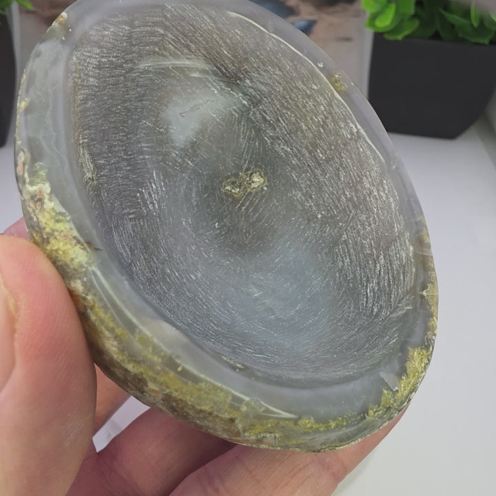 This bowl features the natural, rugged exterior of the original agate nodule, preserving the rough rind and texture—it truly feels like holding a piece of the earth! The inside, however, has been meticulously carved and polished to a smooth, glass-like finish, revealing the intricate layers and crystalline depth unique to Agate.
