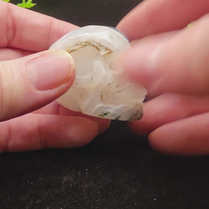 This economical Moss Agate skull carving features an incredibly unique, painterly appearance. What sets it apart is the unusual combination of clear or milky Quartz interwoven with beautiful, blue-green dendritic inclusions—the "moss"—giving it an ethereal, underwater look. The carving showcases the stone's delicate blend of frosty white matrix and striking blue moss agate patches.