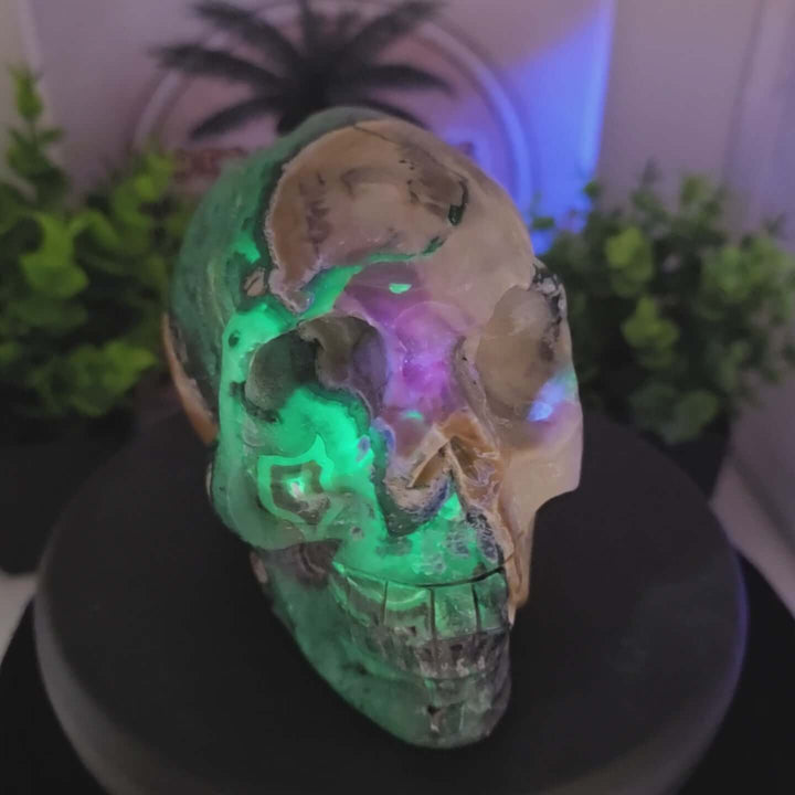This gorgeous skull has banding that turns bright green under UV light! Attached UV pictures were taken with a 254nm Shortwave UV light (254nm) however its also UV reactive using Longwave