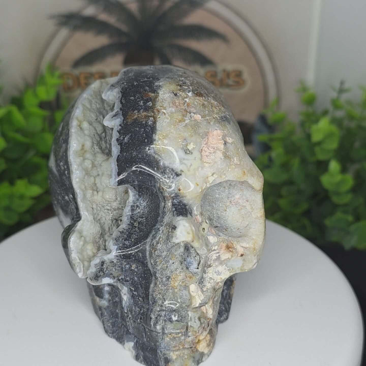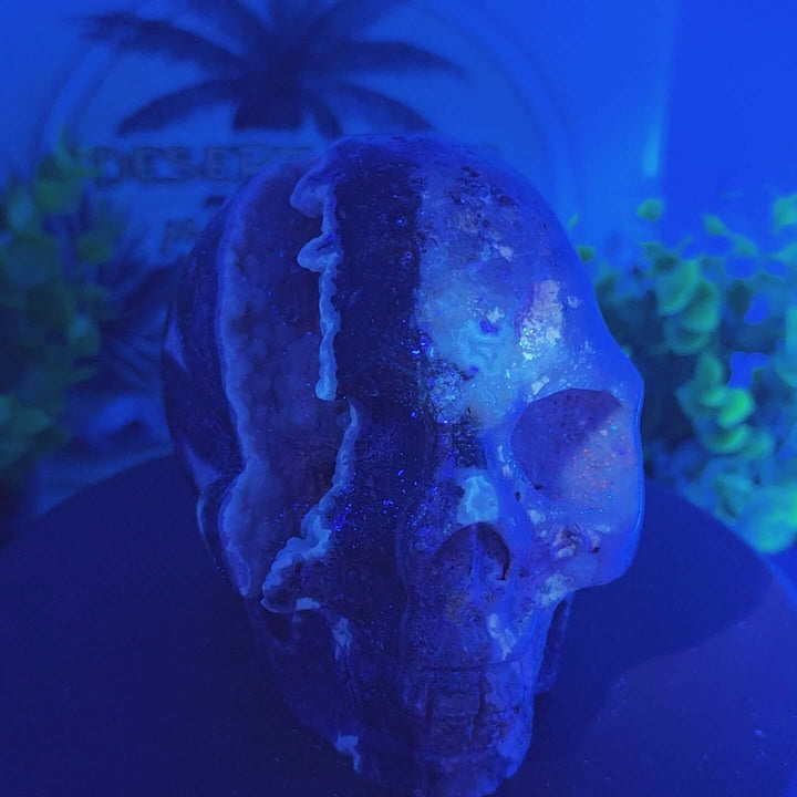 Experience the exceptional charm of our Handcarved Jasper Skull, measuring 4 inches. Made from solid, opaque jasper, this piece highlights the natural beauty of earthy tones and detailed patterns. Unique botryoidal formations—clusters of tiny spheres—create a fascinating texture and visual appeal. Delicate fluorite veins run through the skull, visible under longwave UV light. Perfect for collectors, this jasper skull is both a striking display and a celebration of the earth’s natural wonders.